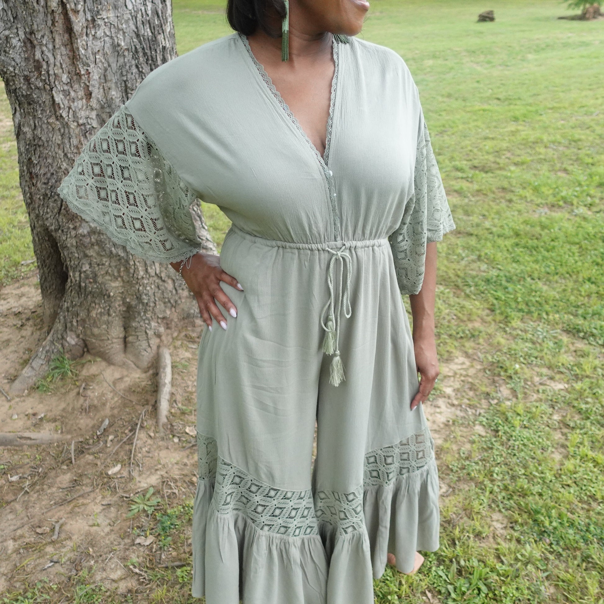 V-neck jumpsuit has a flowy silhouette with lace detail on the sleeve and legs, it also features a drawstring waist line and side pockets. Perfect for any spring or summer events coming up.