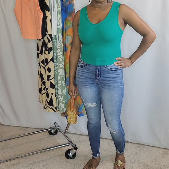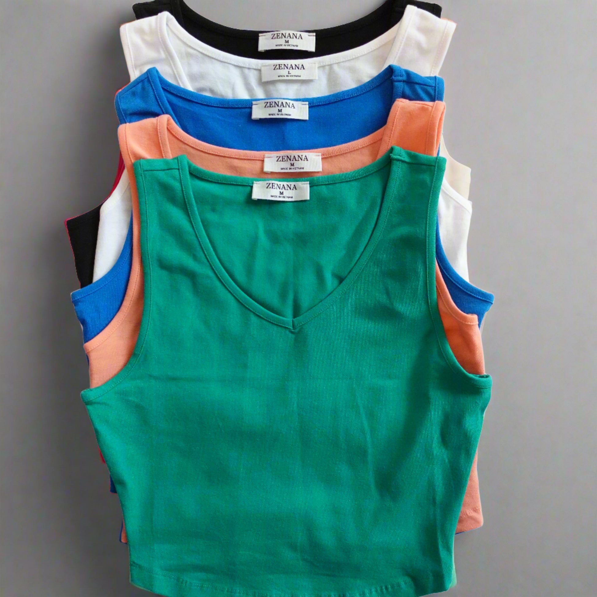 This cute tank top features a trendy v neckline and is made with a soft cotton (95% cotton, 5% spandex). Perfect for everyday wear, this top promises all-day comfort with a touch of style.