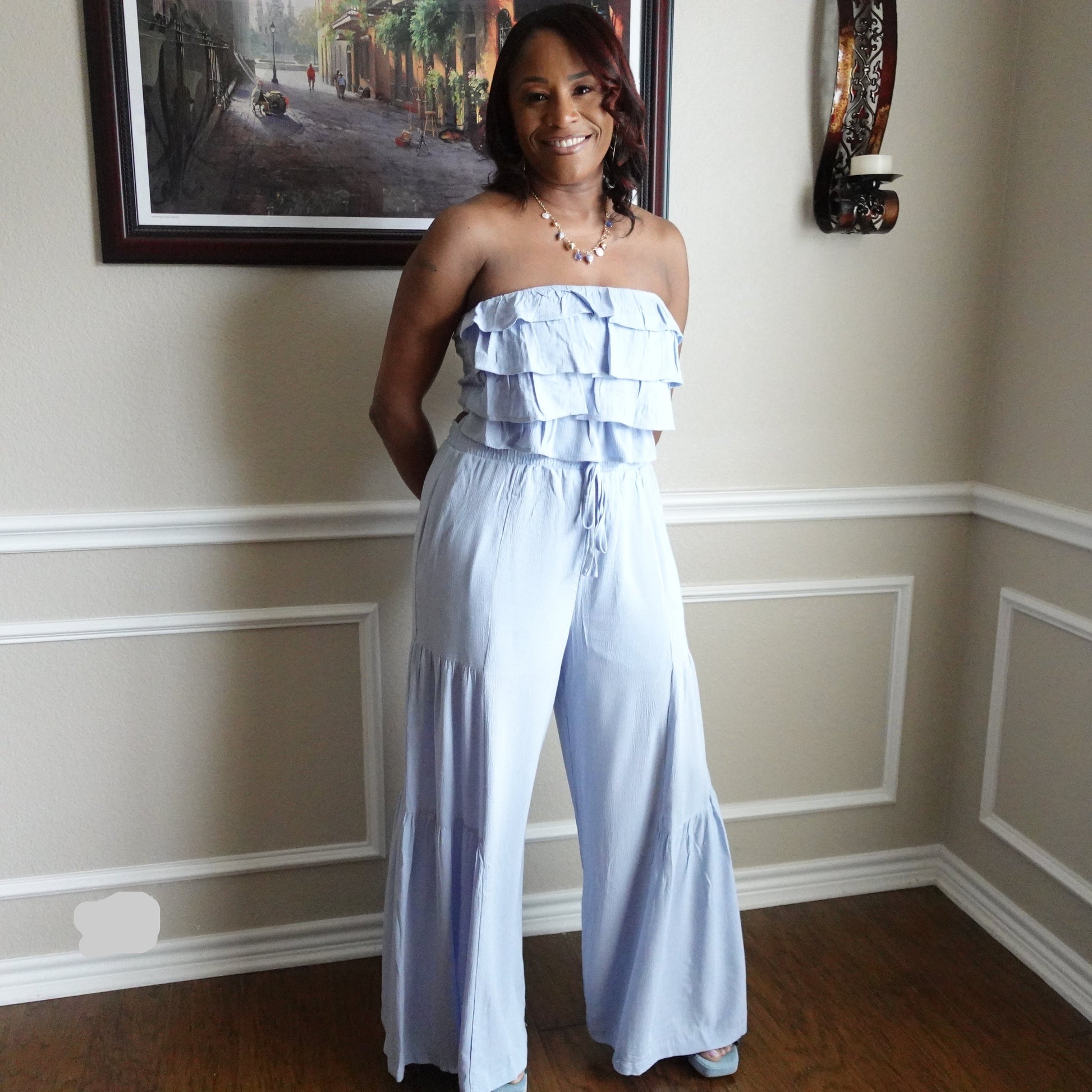 Receive Endless Compliments With This Matching Set. Crafted From Rayon Gauze, The Top Has A Strapless Cut And Features Ruffled Detailing All Over. The Matching Pants Have An Elasticized Waist With An Extra Flowy Silhouette.