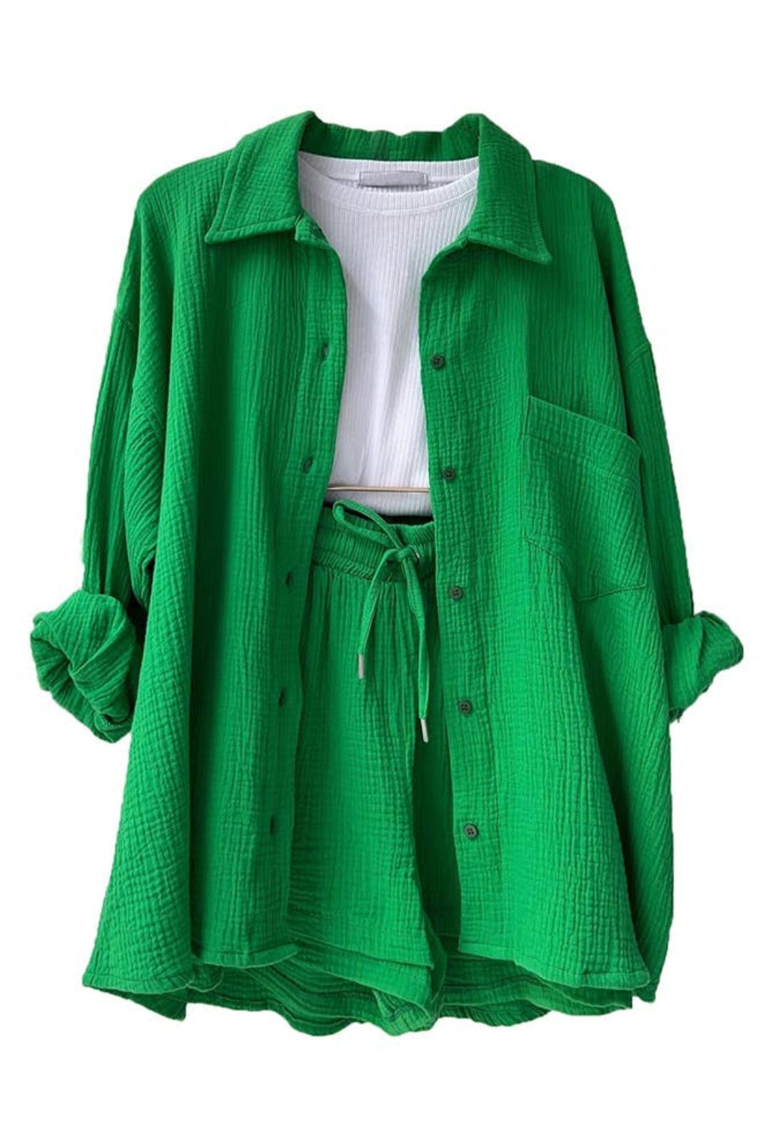 Conquer the day with our Keep This Energy Short Set! Made with light weight fabric, this set features a button up shirt and drawstring shorts for ultimate comfort and style. Don't miss out on this must-have for your active and adventurous lifestyle!