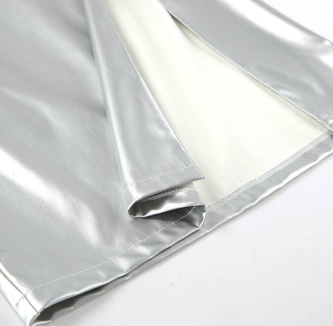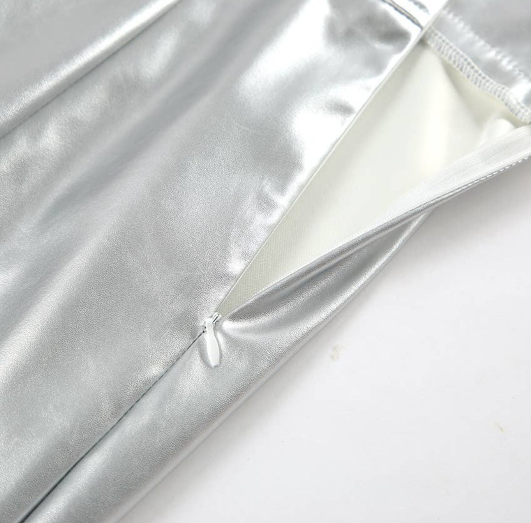 Unleash your inner fashionista with our Metallic Skirt! This stunning piece features a leg split and high rise for a flattering fit, along with a side zipper for easy wear. Made with eye-catching metallic fabric, this skirt is sure to turn heads and elevate any outfit.