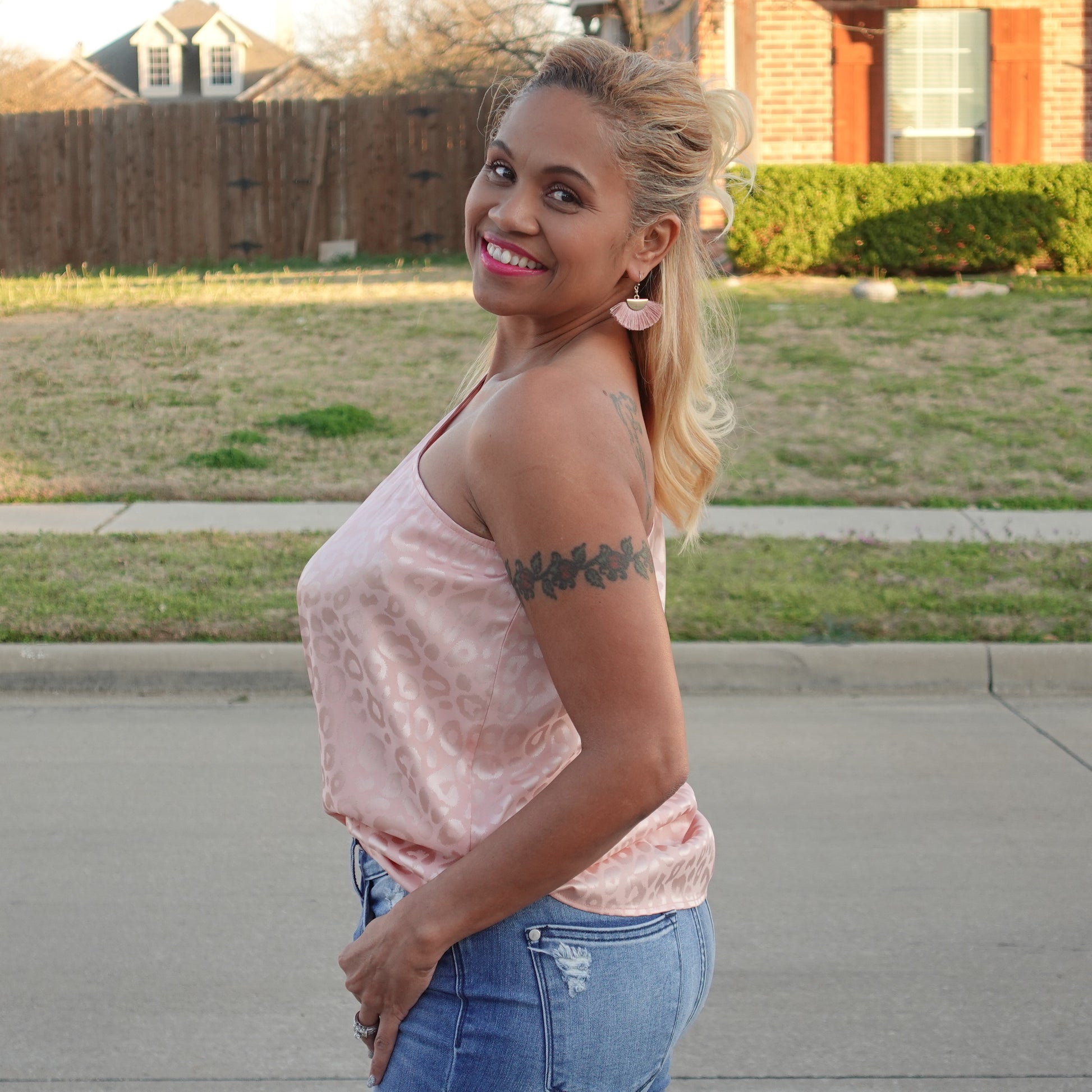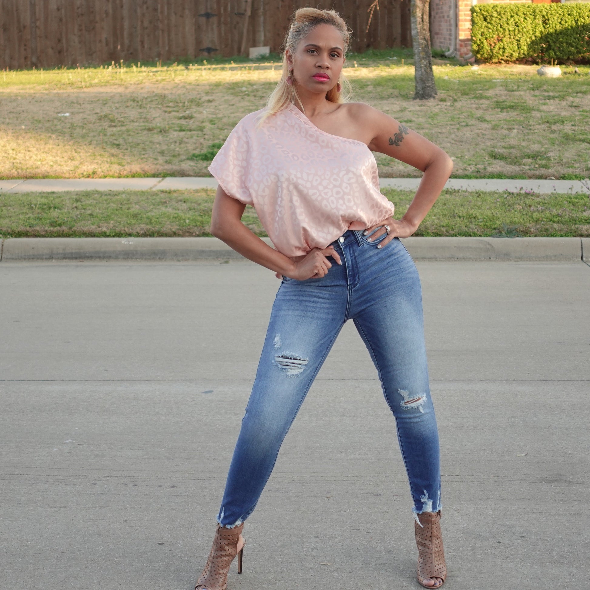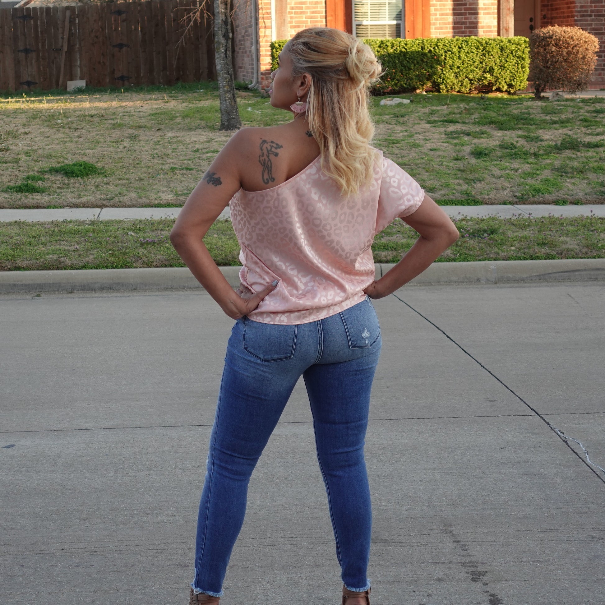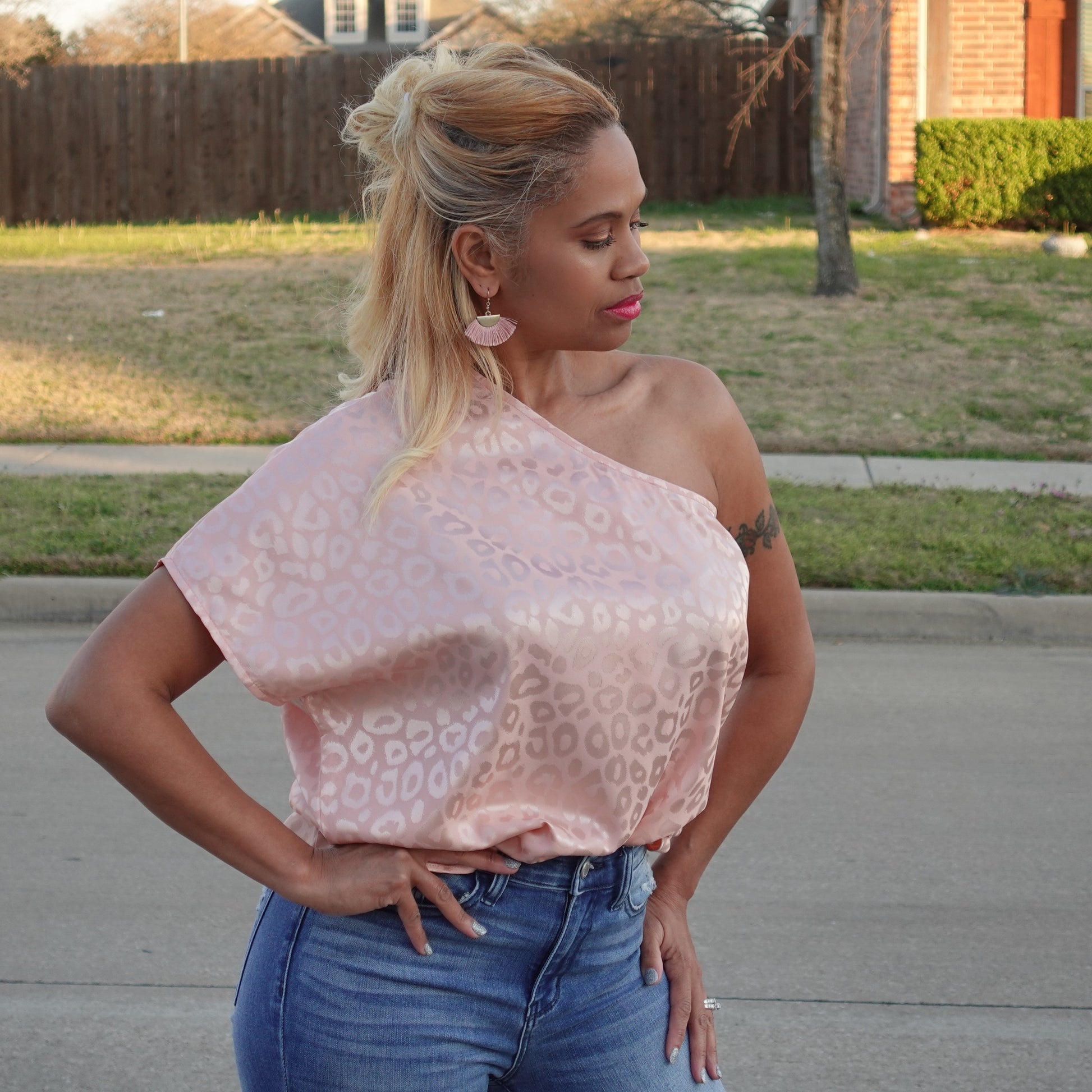 This lightweight top is a Beauty! Its features a Sexy one shoulder asymmetrical off the shoulder neckline with light shades of blush pink. Perfect for a night out on the town! You can pair it with jeans and a heel or for a more casual look pair it with scandals.
