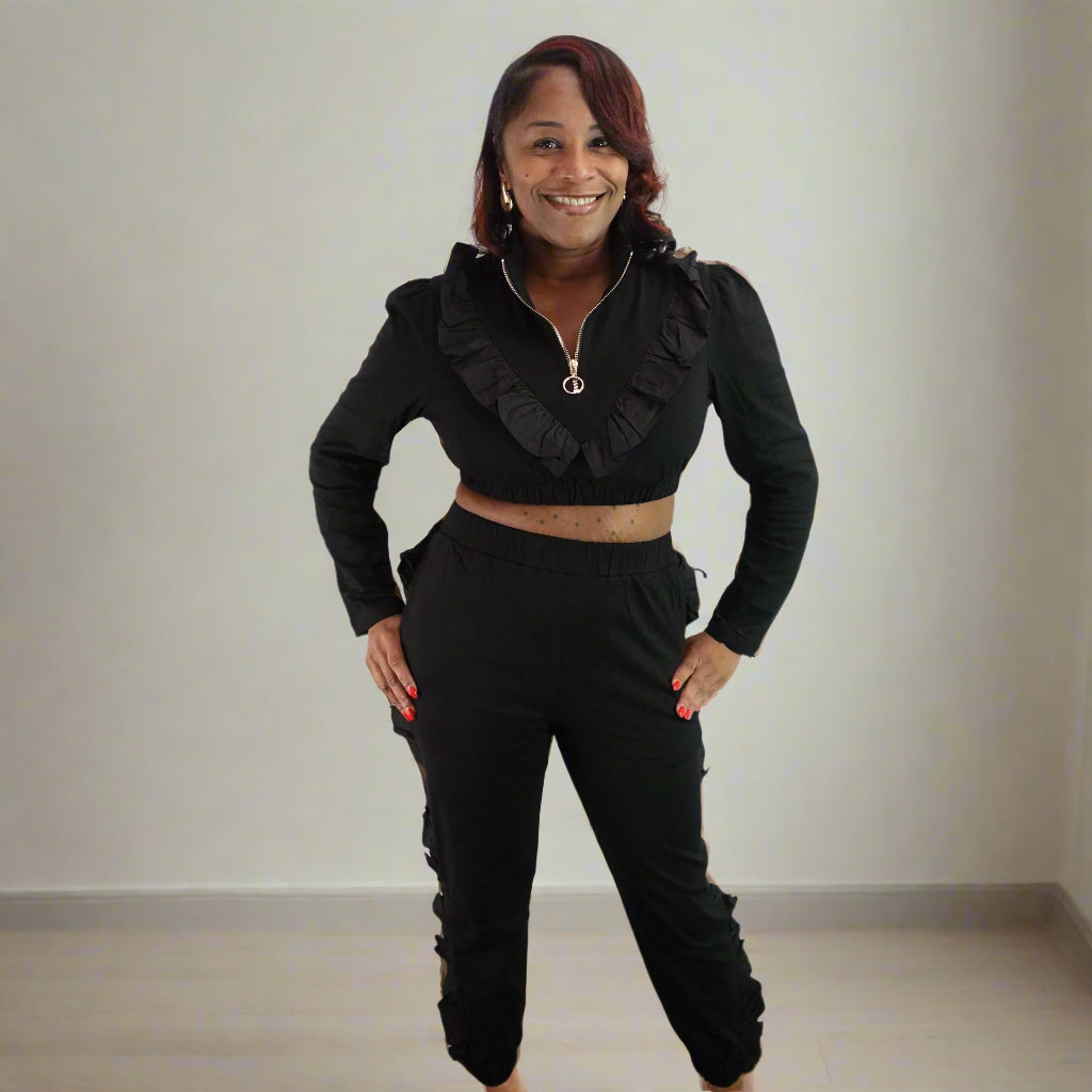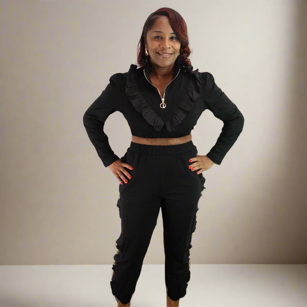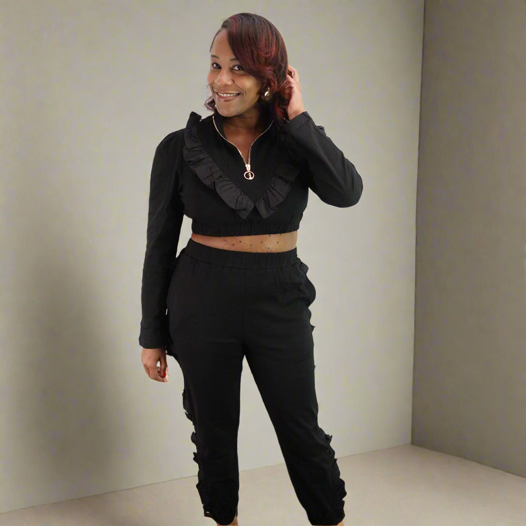 Upgrade your wardrobe with our Ruffle Detail Pant Set. This stylish set features a crop top with long sleeves and a front zipper, paired with ruffle detailed pants and convenient side pockets. Make a statement with the subtle ruffle accents and stay comfortable and fashionable all day long.