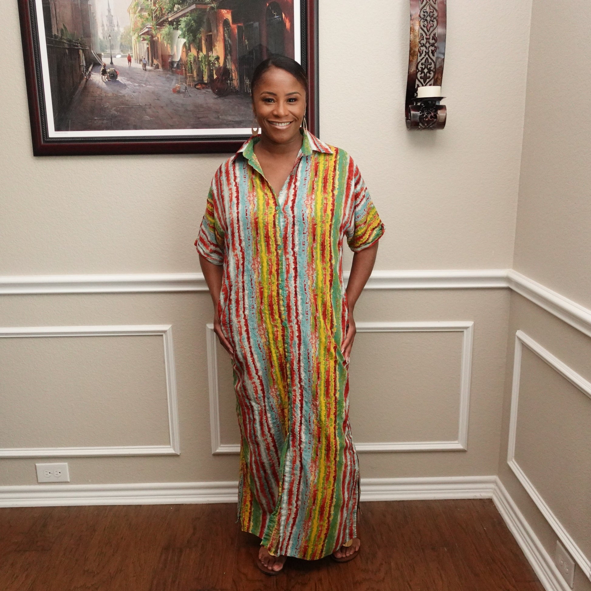 This bold maxi dress features a shirt-style silhouette with a collared neckline and button-front closure. The relaxed fit and vibrant striped pattern make it a standout piece, while the side slit adds a hint of allure. Perfect for casual days or vacation wear, this lightweight dress also includes convenient side pockets for functionality.